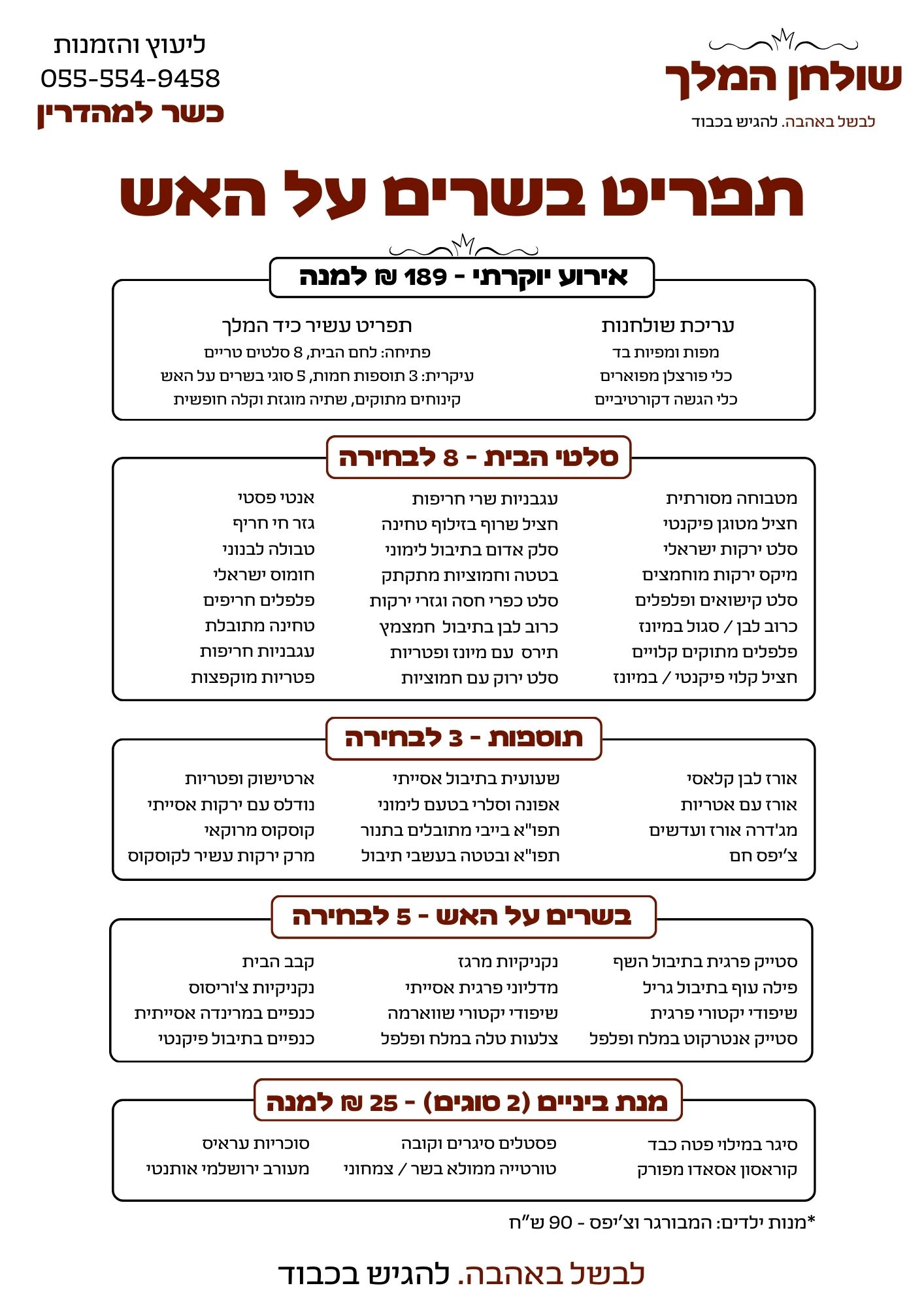 • בשרים פרימיום צלויים לשלמות • סלטים טריים • תוספות עשירות • תעודת כשרות בד"ץ בית יוסף