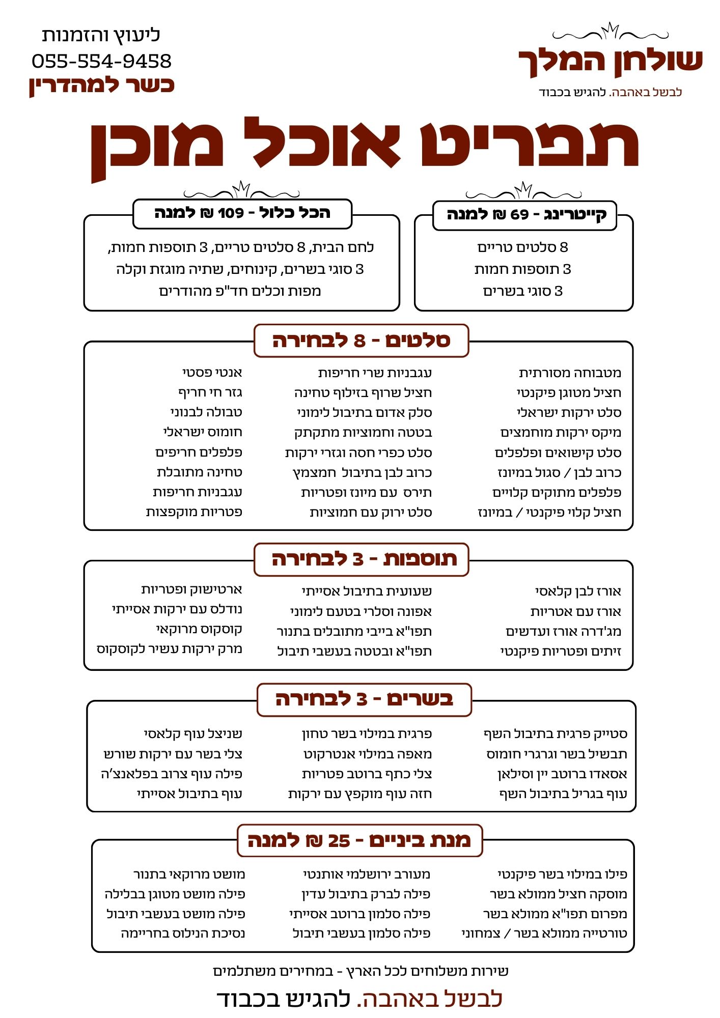 שיחת תיאום קצרה בטלפון/וואטסאפ 055-938-4148 – מספר סועדים והעדפות.