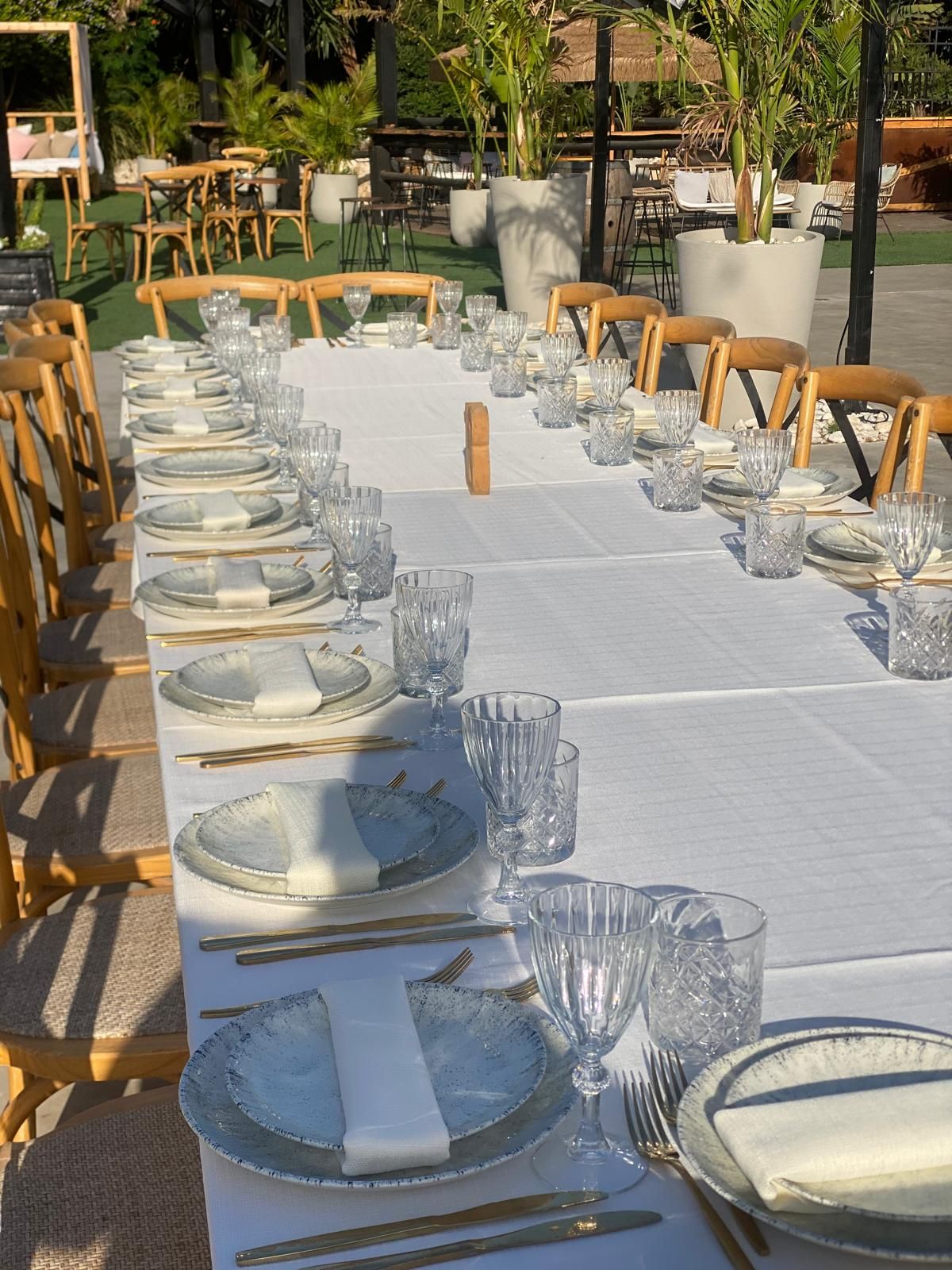 שירות עריכת שולחנות: מפות בד, כלים חד"פ מהודרים, כולל כלי הגשה דקורטיביים.