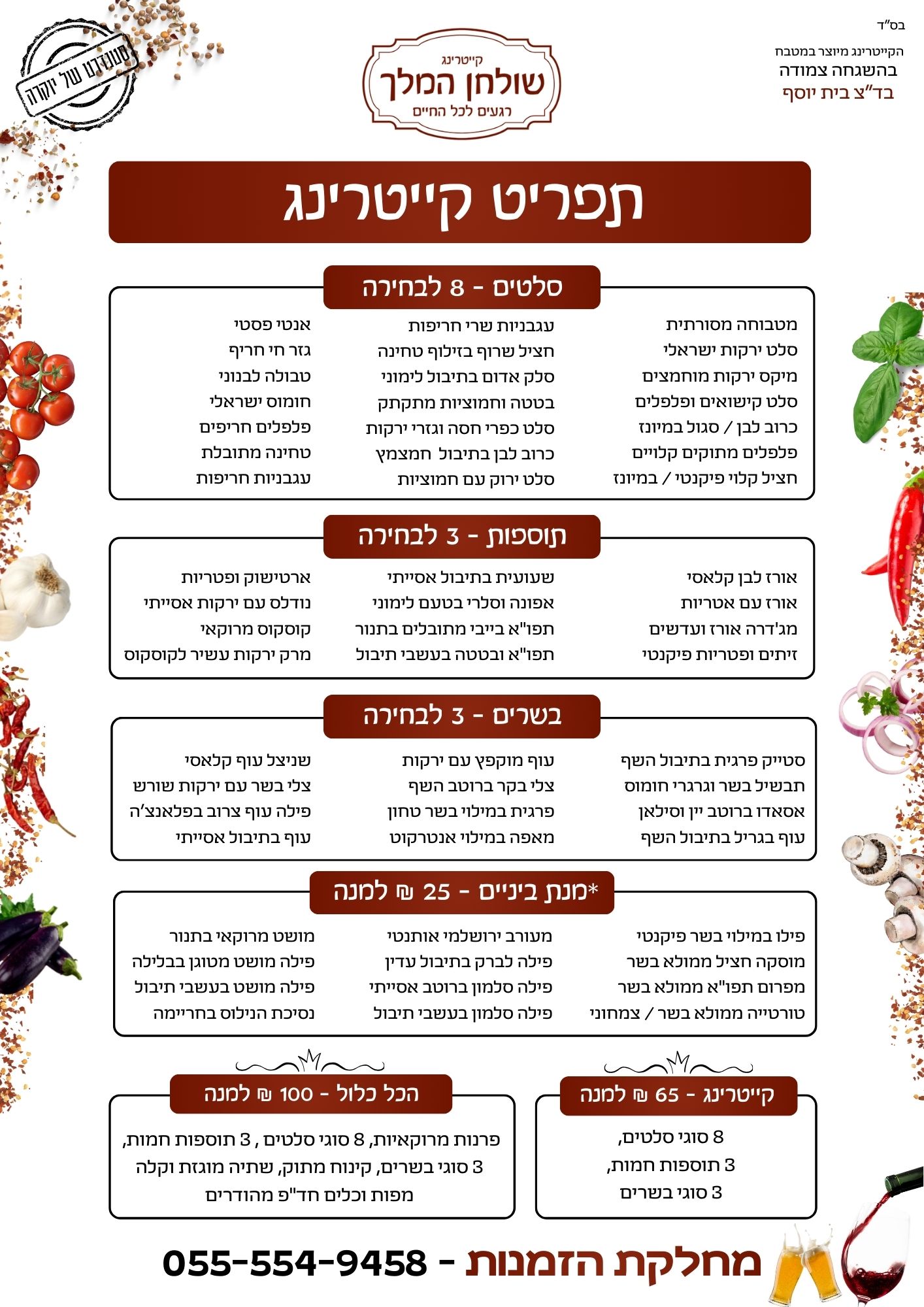 שיחת תיאום קצרה בטלפון/וואטסאפ 055-554-9458 – מספר סועדים והעדפות.