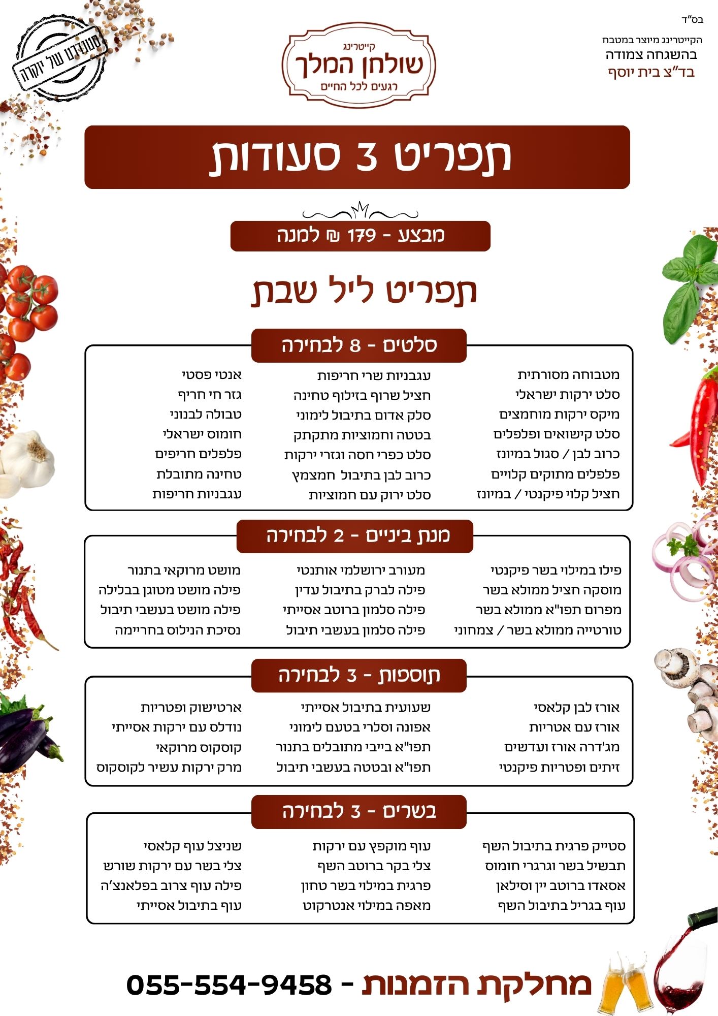 מבצע ההשקה שלנו עומד על 179 ₪ לאדם לשלוש סעודות מלאות – מחיר שמעניק לכם שולחן עשיר ושקט נפשי בלי פשרות על איכות.