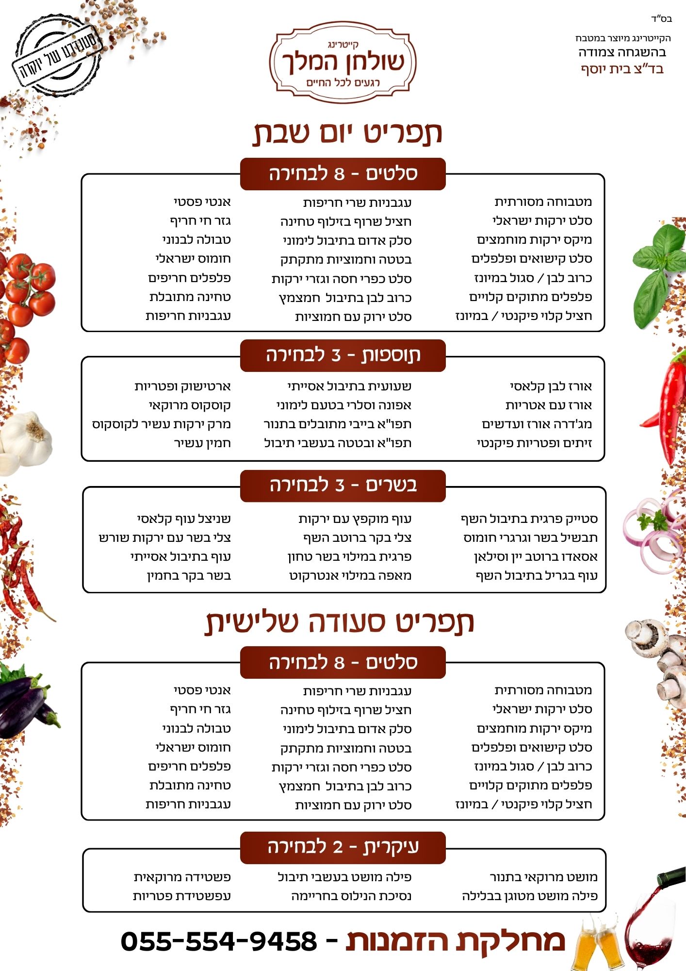 צלצלו ל‑055-554-9458, או שלחו הודעת וואטסאפ – ותגלו כמה קל להפוך את השבת שלכם לאירוע שהאורחים יזכרו. “שולחן המלך” – לבשל באהבה. להגיש בכבוד.