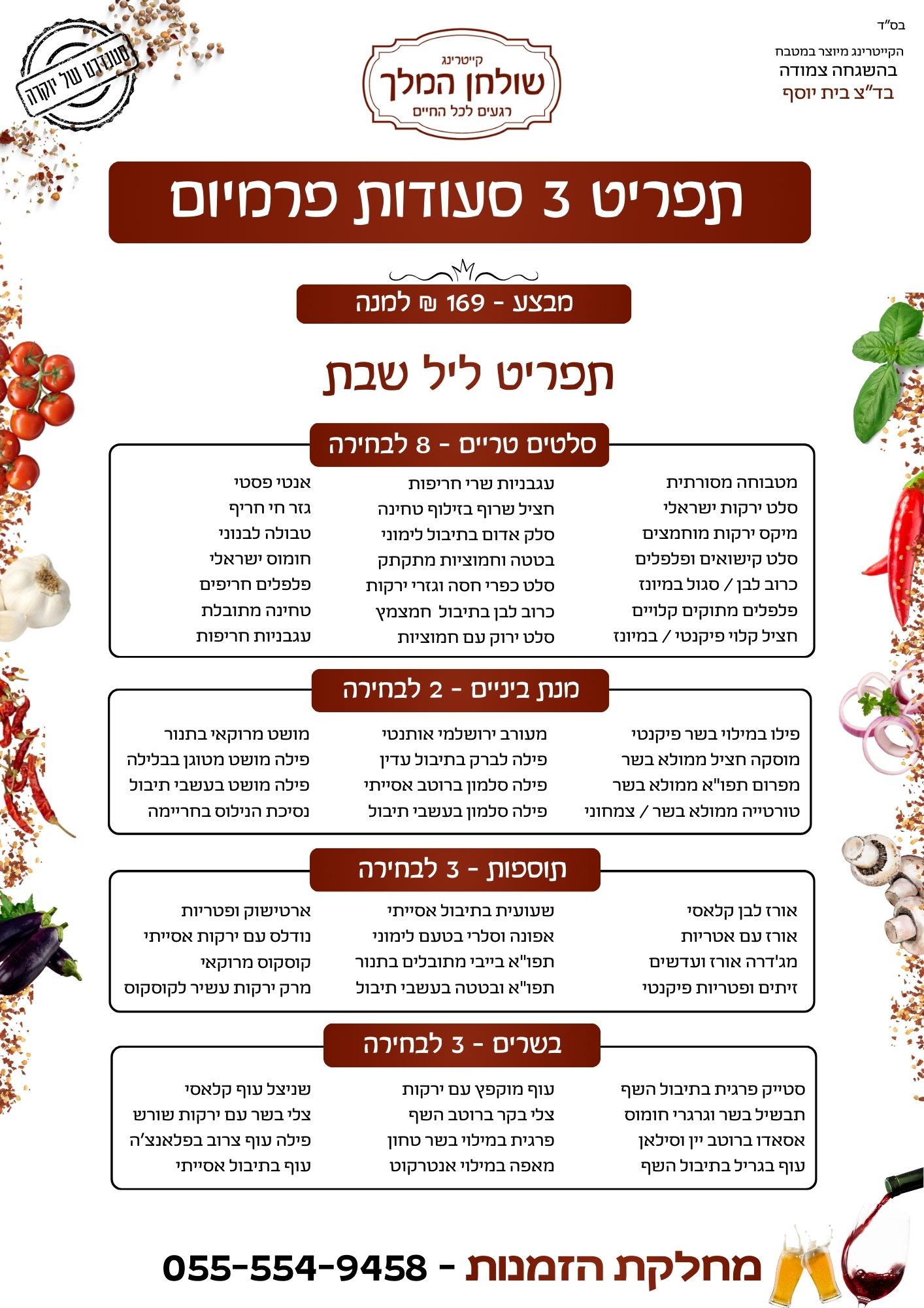מבצע ההשקה שלנו עומד על 169 ₪ לאדם לשלוש סעודות מלאות – מחיר שמעניק לכם שולחן עשיר ושקט נפשי בלי פשרות על איכות.